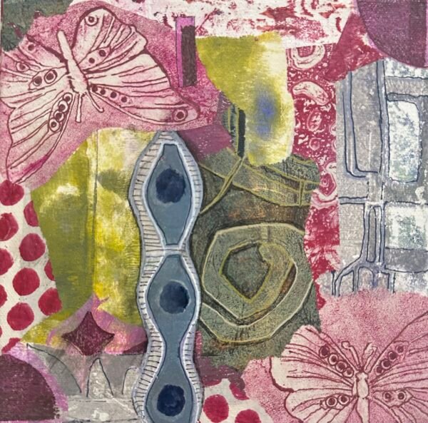 Handmade painted papers on the gelli plate with stencils, stamps, and acrylic paints. Can be hung in any direction. Has Three Dots. The artwork is wrapped around all edges of this collage.