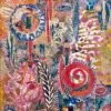 Plant life, a gated door, and a window, imaginative, magical, with a conceptual thought of a house, cottage, or castle somewhere in the garden, hidden. All handmade papers, shapes, and objects crafted with acrylic paint and stencils then embellished.